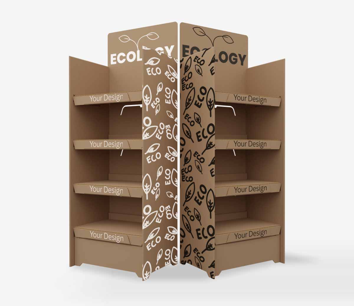 Présentoirs en carton recyclable pour produits, stands d'exposition et points de vente. Personnalisables et écologiques.